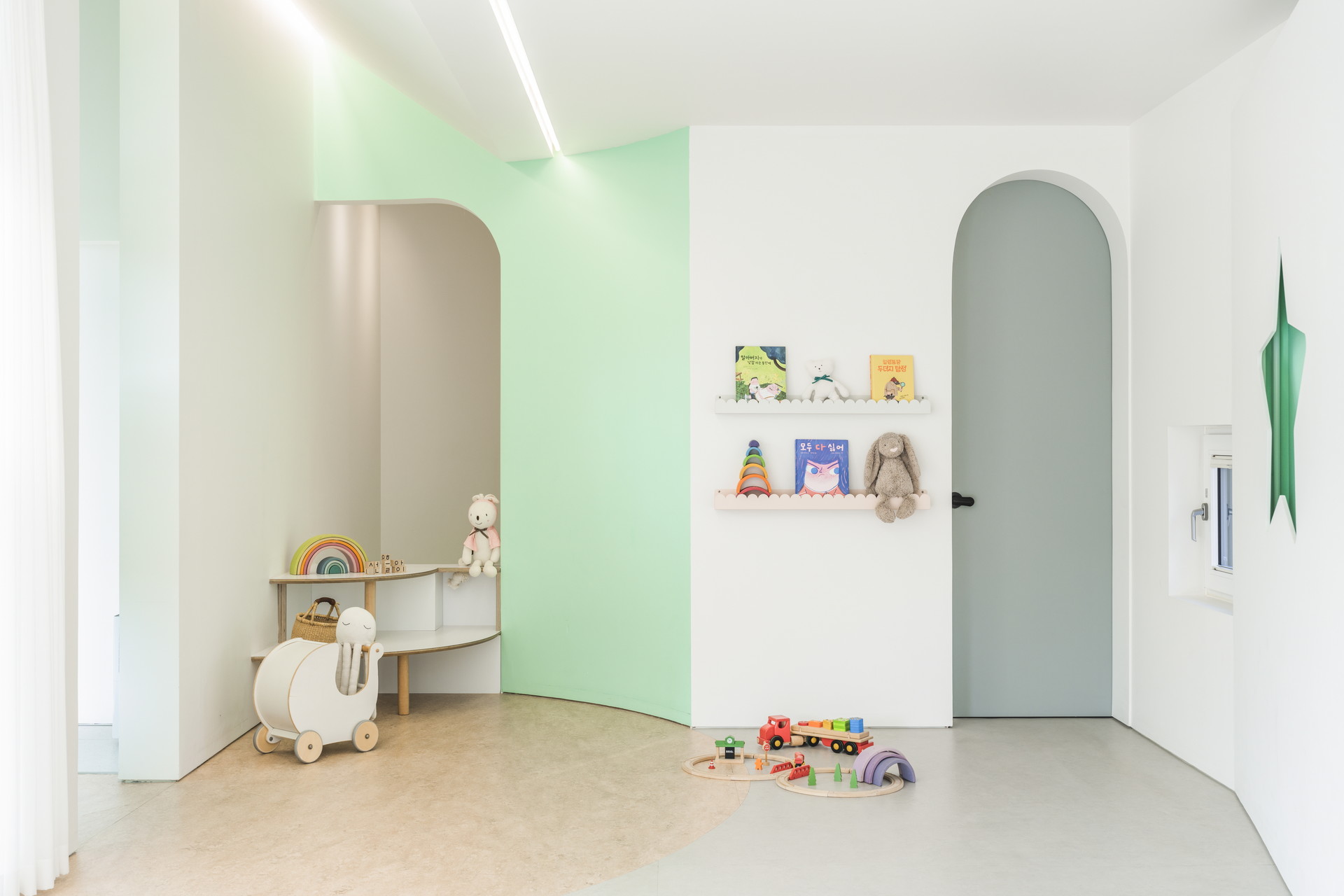미끄럼틀과 원목 블럭, 인형이 함께하는 놀이공간은