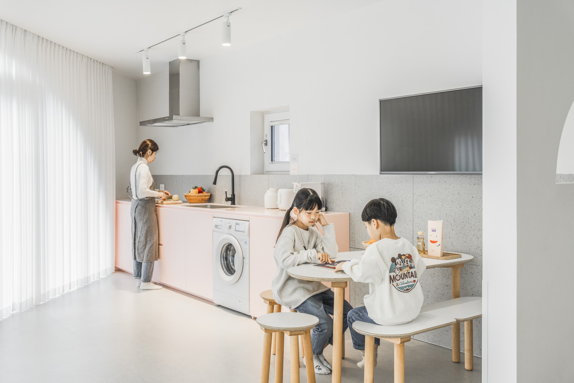 거실에서 아이를 바라보며 안심하고 함께할 수 있어요.
